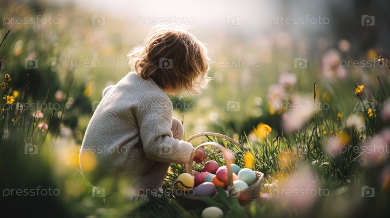 Ребенок, прислонившийся к цветущему лугу с корзиной красочных пасхальных яиц, радостная весенняя сцена охоты на яйца с цветами, солнечным светом, семейными традициями и детской игрушкой на открытом воздухе