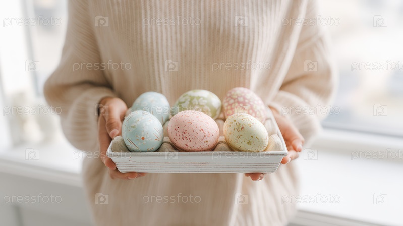 Женщина держит поднос с пастельно окрашенными пасхальными яйцами, яркая минимальная домашняя интерьерная сцена символизирует весеннее празднование, традиции и сезонное украшение