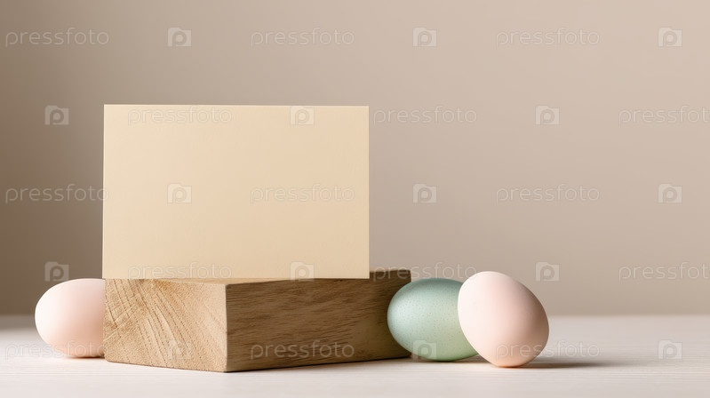 Минимальная пасхальная композиция с пастельными яйцами рядом с пустой карточкой на деревянном блоке, чистая весенняя сцена макета, предназначенная для приветственного сообщения или сезонного брендинга