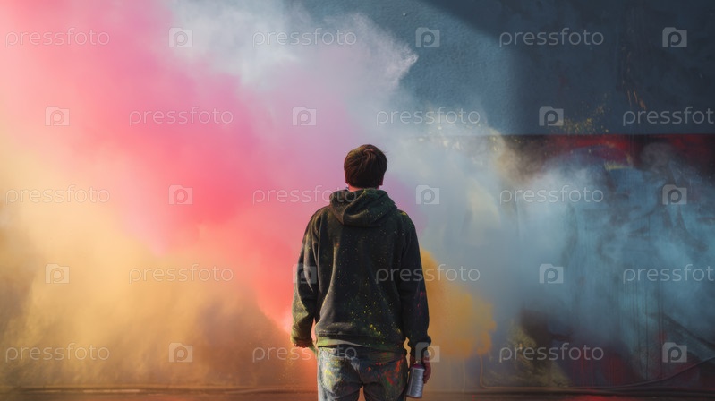 Художник городского граффити распыляет красочную аэрозольную краску на стене улицы, драматическое облако пигмента и дыма создает яркую сцену уличного искусства с современным творческим выражением