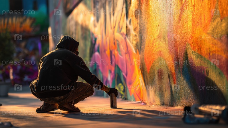 Уличный художник, приседающий рядом с красочной стеной граффити, распыляя аэрозольную краску, городская сцена уличного искусства с яркой фреской, творческим выражением и подпольной культурой