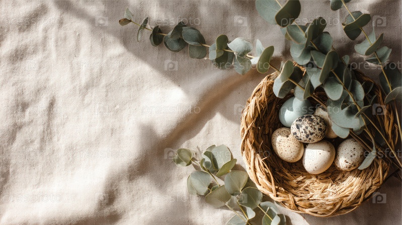 Естественное пасхальное гнездо с пятнистыми перепелиными яйцами и ветвями эвкалипта на льняной ткани, деревенская сцена весеннего украшения вдохновлена органическим сельским образом жизни