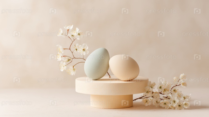 Минимальный пасхальный макет с пастельными яйцами на нейтральном подиуме и цветочной ветви, элегантный весенний фон продукта для праздничного дизайна, презентации бренда и сезонного украшения