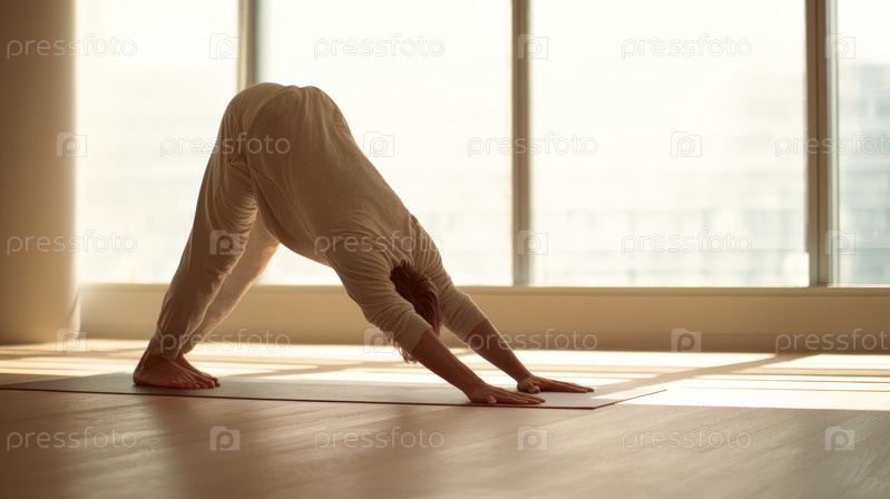 Мужчина практикует йогу вниз собака позирует на коврике в яркой минималистической студии, рутина оздоровления сосредоточена на гибкости, фитнесе, внимательности, балансе и здоровом образе жизни