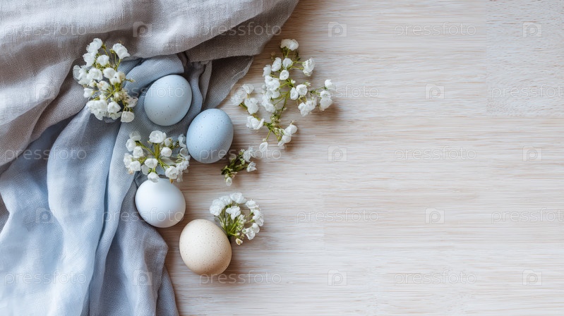 Пастельные пасхальные яйца с нежными белыми цветами на мягком тканевом фоне, минимальный весенний плоский слой с ботаническими деталями и нежными натуральными тонами