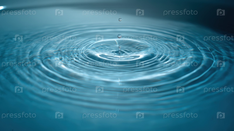 Макро капли воды, поражающие голубую поверхность, создают концентрические волны, минимальную сцену движения жидкости, представляющую чистоту, свежесть, гидратацию и спокойное понятие естественного баланса