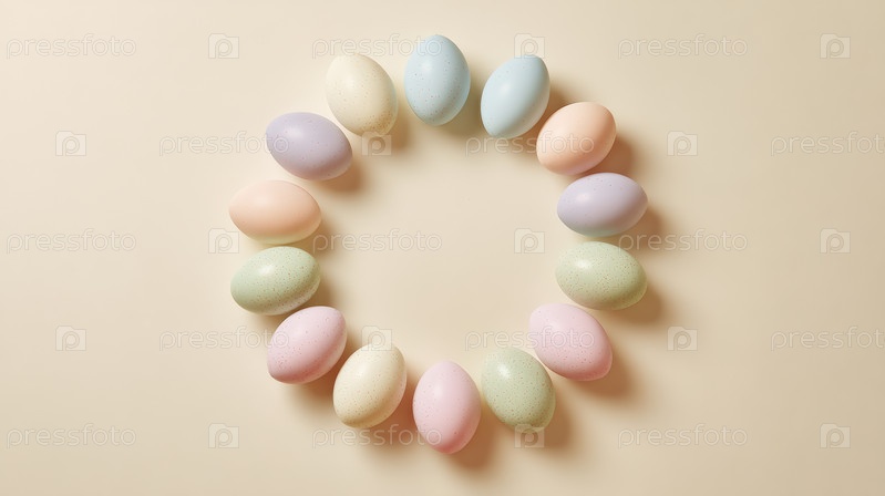 Пастельные пасхальные яйца, расположенные в круговом узоре на мягком бежевом фоне, минималистическая весенняя композиция идеально подходит для поздравительных открыток, праздничного дизайна и сезонного декора