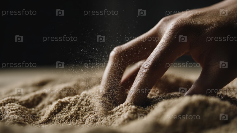 Человеческая рука медленно тонет в мелкий песок, макро тактильная текстура сцены иллюстрирует сенсорный прикосновение, осознанность, терапию заземления и естественную концепцию релаксации
