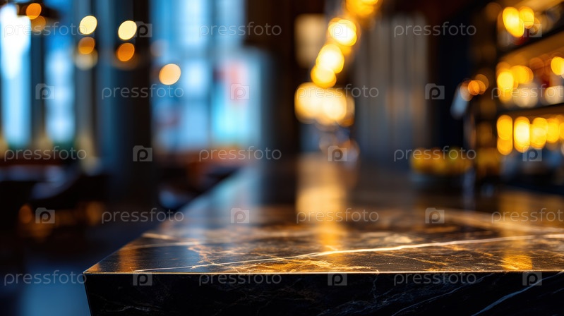 Роскошная мраморная столешница с теплыми огнями боке в современном интерьере, элегантный фон каменной поверхности для дизайна кухни, ресторанного бара или элитного домашнего декора