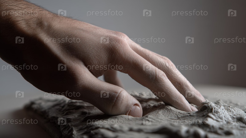 Человеческая рука прессует мягкую глиняную поверхность в керамической студии, процесс тактильной скульптуры на близком расстоянии показывает творчество ремесленников, ручное ремесло, керамический материал и художественный дизайн работы