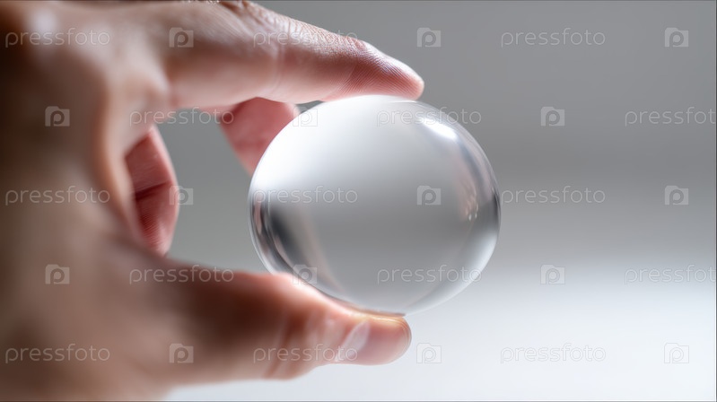 Рука сжимает прозрачную гелевую сферу в минималистическом студийном свете, макро тактильная концепция текстуры символизирует сенсорную терапию, облегчение стресса, осознанность и современное внимание к оздоровлению