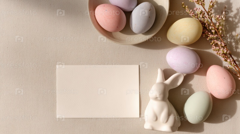 Минимальная пасхальная плоская кровать с пастельными яйцами, керамическим кроликом и весенними цветами на нейтральном столе с пустой поздравительной карточкой, элегантным фоном сезонного украшения