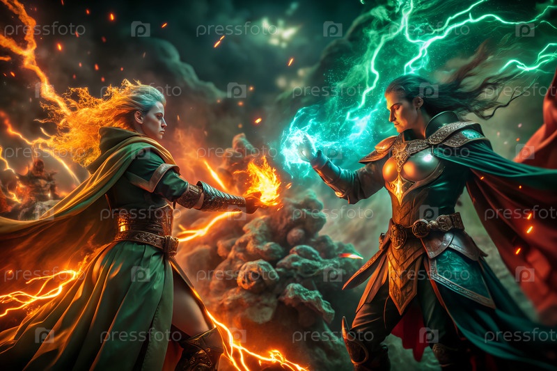 Эпическая фэнтезийная битва элементарных магов, бросающих огонь и молниеносную магию в вулканическом пустынном ландшафте