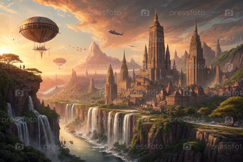 Эпический город фантазии с водопадами, летающими дирижаблями и горами при закате солнца, футуристическим горизонтом и волшебным пейзажем