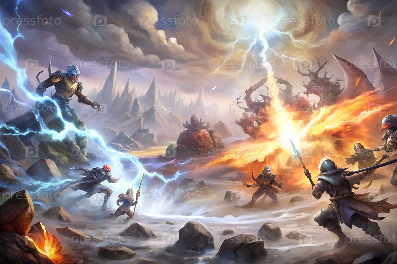 Эпическая фэнтезийная битва элементарных магов, бросающих огонь и молниеносную магию в вулканическом пустынном ландшафте