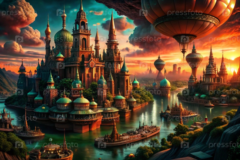Эпический город фантазии с водопадами, летающими дирижаблями и горами при закате солнца, футуристическим горизонтом и волшебным пейзажем