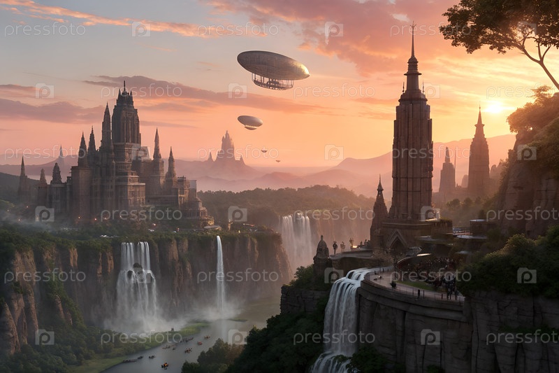 Эпический город фантазии с водопадами, летающими дирижаблями и горами при закате солнца, футуристическим горизонтом и волшебным пейзажем