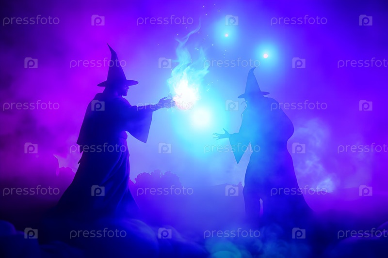 Фантастические волшебники сражаются со светящимися магическими заклинаниями на пейзаже туманных холмов, силуэтами в мистической атмосфере