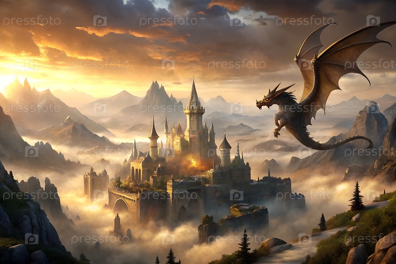 Фантастический дракон летит возле средневекового замка в туманных горах на закате, эпическая мифическая пейзажная сцена