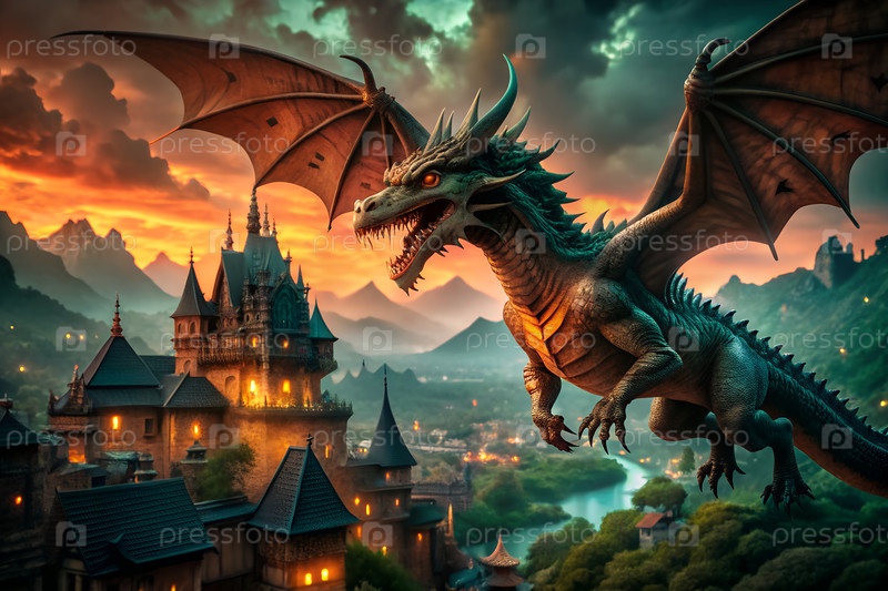 Фантастический дракон летит возле средневекового замка в туманных горах на закате, эпическая мифическая пейзажная сцена