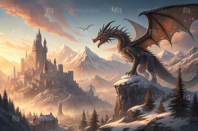 Фантастический дракон летит возле средневекового замка в туманных горах на закате, эпическая мифическая пейзажная сцена