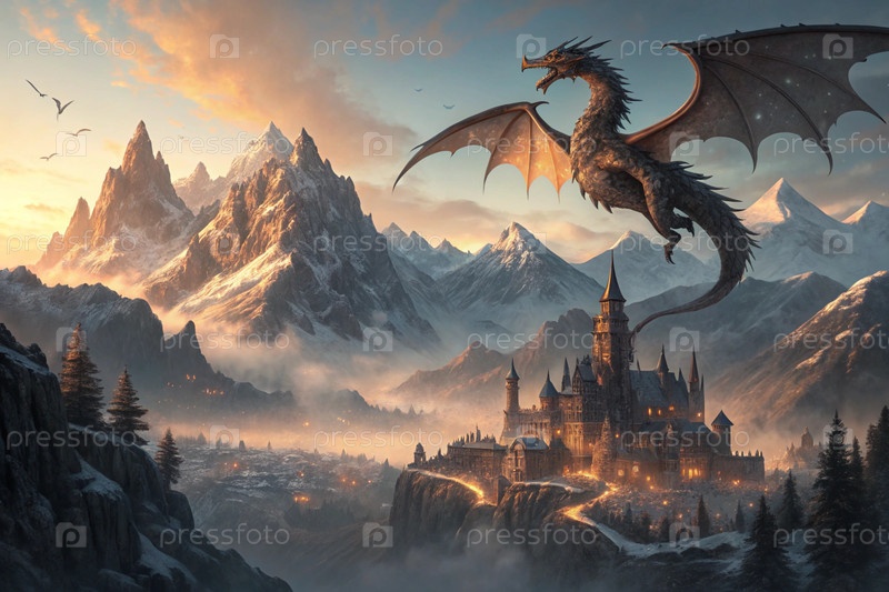 Фантастический дракон летит возле средневекового замка в туманных горах на закате, эпическая мифическая пейзажная сцена