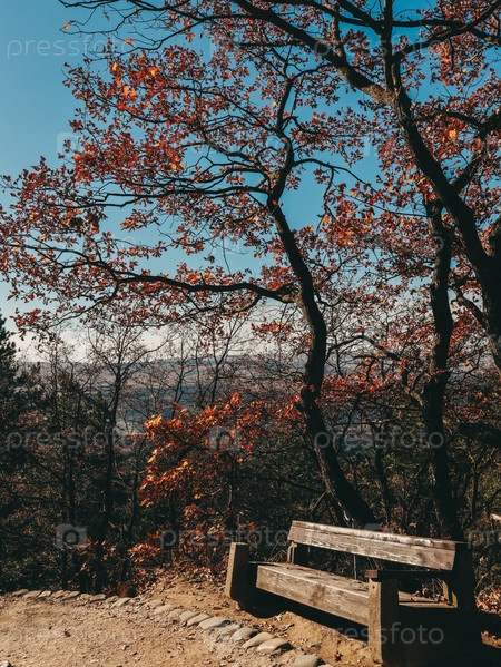 Скамейка на фоне осеннего дерева в курортном парке Кисловодска