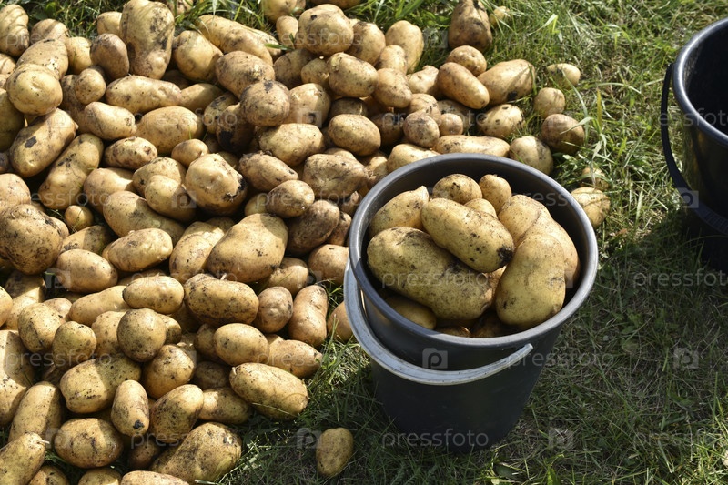 Копание картофеля. Желтые клубни в ведрах. Уборка клубней