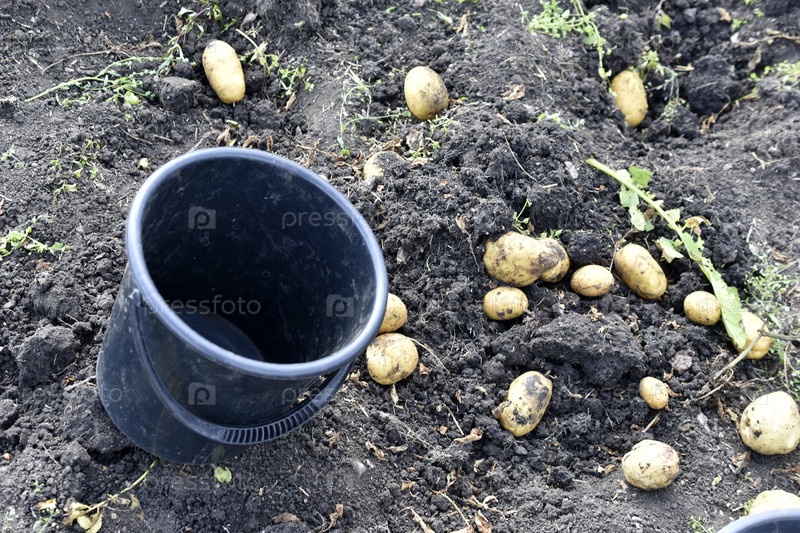 Копание картофеля, ведра с картофелем в поле, желтые клубни