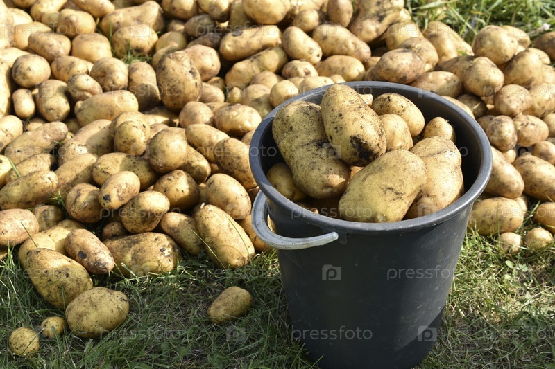 Копание картофеля. Желтые клубни в ведрах. Уборка клубней
