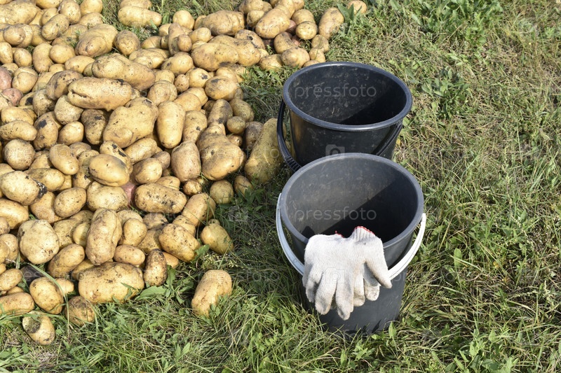 Копание картофеля, ведра с картофелем в поле, желтые клубни