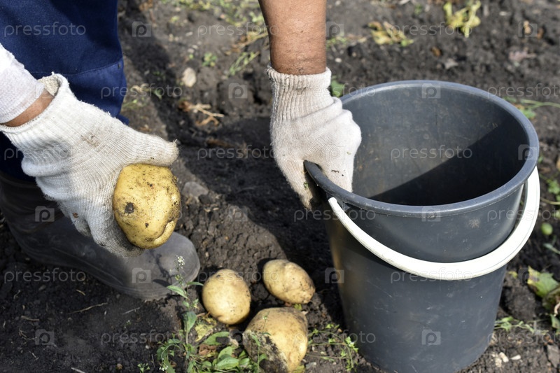 Копание картофеля. Рука берет картофель. Желтые клубни картофеля
