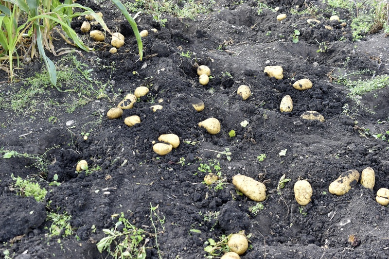 Выкапывание картофеля, желтые клубни в земле