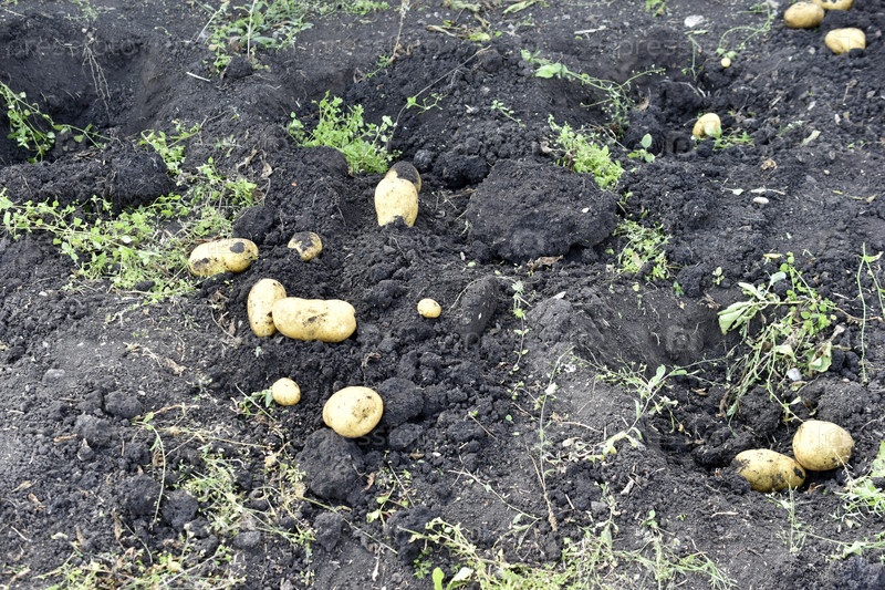 Выкапывание картофеля, желтые клубни в земле