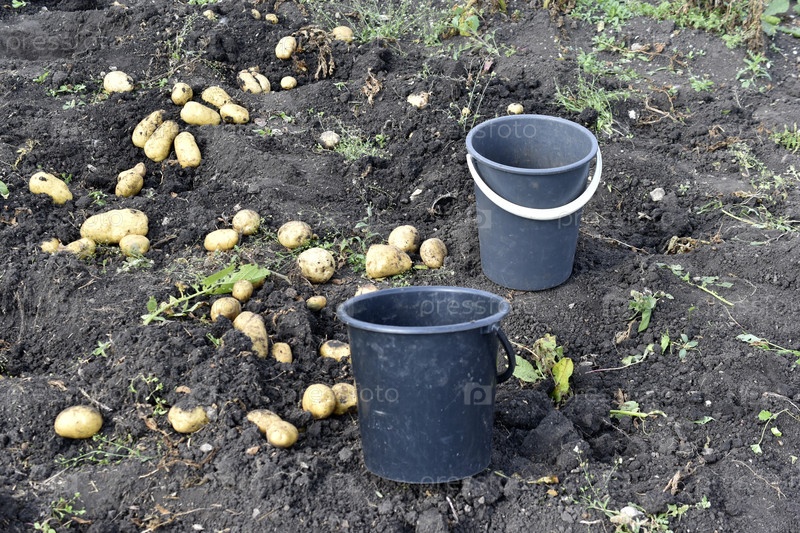 Копание картофеля, ведра с картофелем в поле, желтые клубни