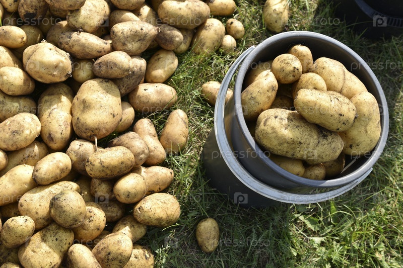 Копание картофеля. Желтые клубни в ведрах. Уборка клубней