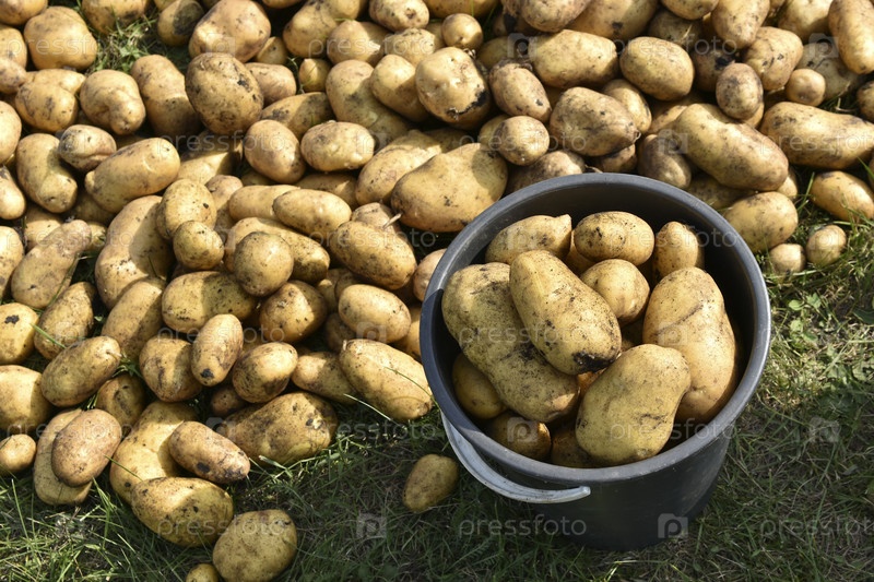 Копание картофеля. Желтые клубни в ведрах. Уборка клубней