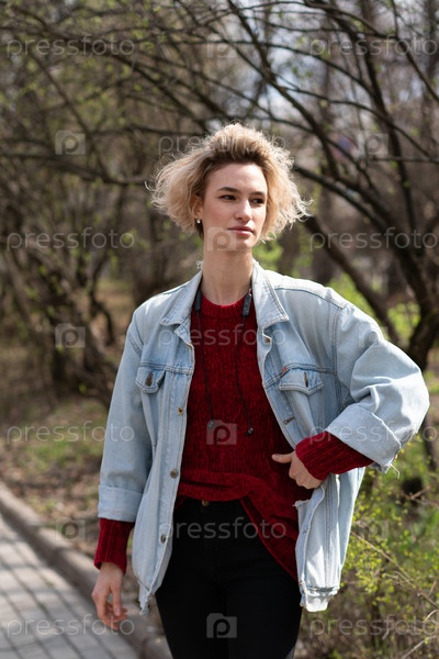 Молодая красивая женщина позирует снаружи в красном свитере