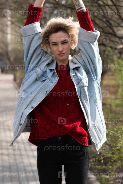 Молодая красивая женщина позирует снаружи в красном свитере