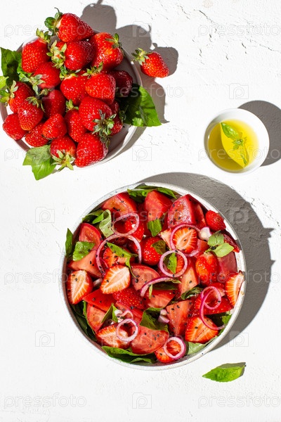 Летний салат с клубникой, томатами, базиликом и красным луком