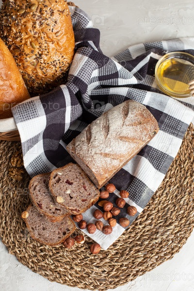 Буханка ржаного хлеба с орехами и сухофруктами лежит на клетчатом черно-белом полотенце