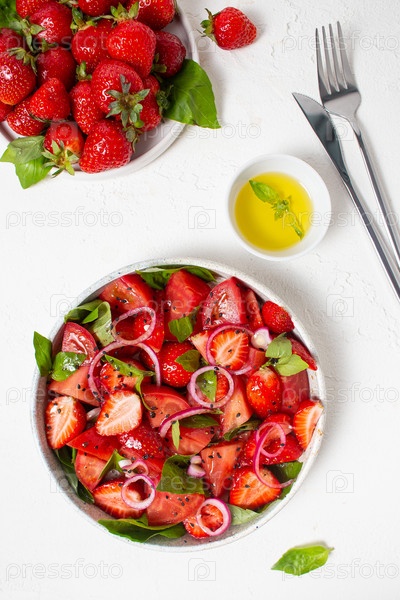 Летний салат с клубникой, томатами, базиликом и красным луком