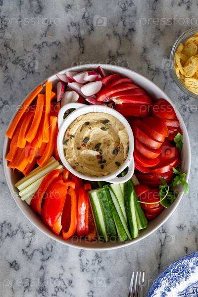 Блюдо с нарезанными овощами и хумусом на мраморном столе
