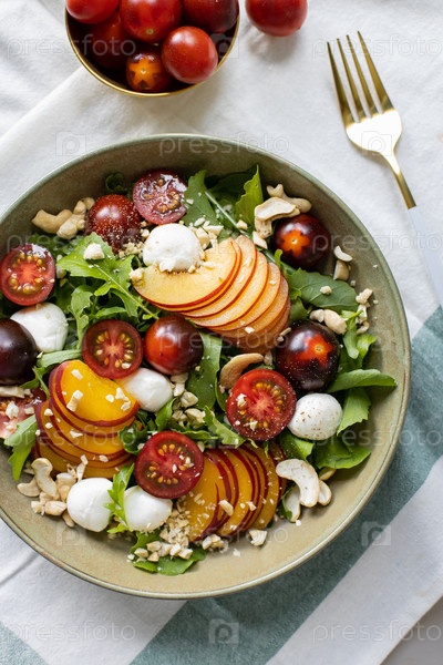 Свежий салат с вишневыми помидорами, персиками и сыром на столе с вилкой и миской винограда