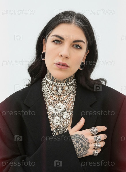 Портрет модели в черном костюме и массивных украшениях на шее с татуировками на фоне белой стены в студии