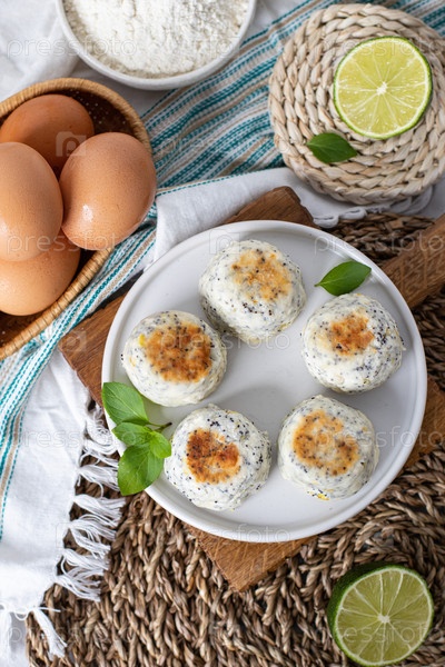 Сырники с маком, яйцами, мукой и лаймом, подаваемые на деревенской тарелке для завтрака