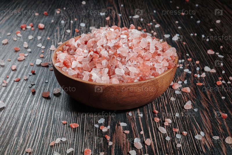 Деревянная чаша, заполненная розовыми кристаллами гималайской соли на темном деревянном столе, натуральная минеральная приправа для здоровой кулинарии и спа-концепций