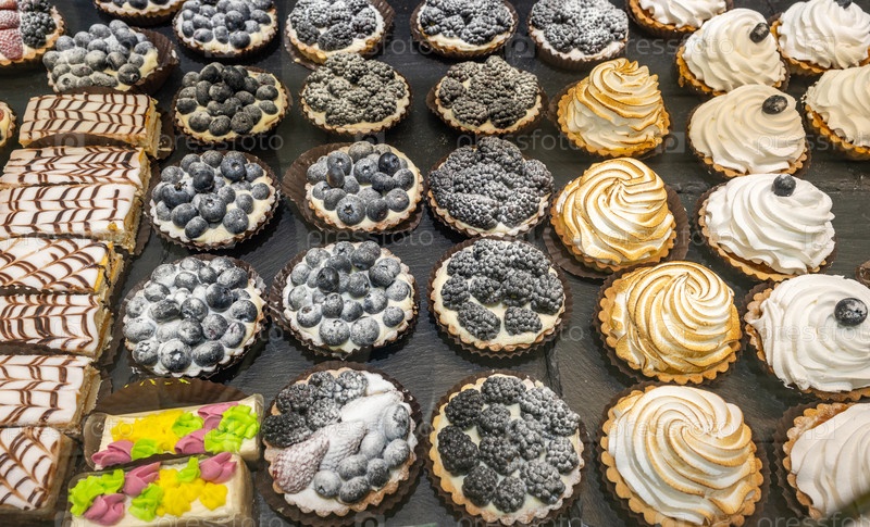 На выставке представлены разнообразные пирожные из ягод и печенье с сливочным маслом