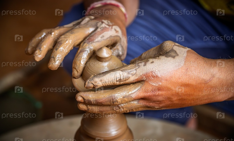 Умелые руки ремесленников формируют влажную глину на вращающемся гончарном колесе, создавая керамическую вазу в традиционной глинтарной мастерской