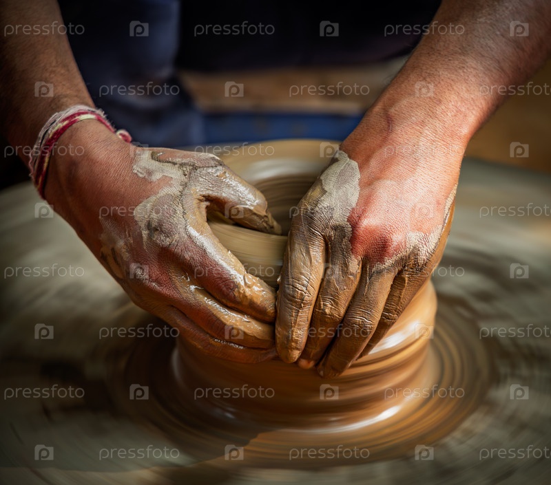 Умелые руки ремесленников формируют влажную глину на вращающемся гончарном колесе, создавая керамическую вазу в традиционной глинтарной мастерской